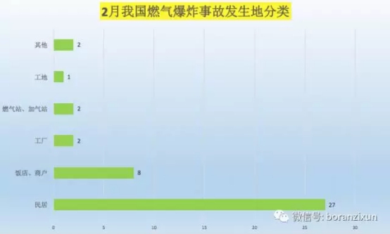2017年2月發(fā)生在居民家中的燃?xì)獗ㄊ鹿蕿?7起,飯店、商戶發(fā)生8起。
