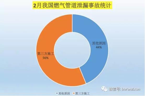 另外,2月份因第三方施工導(dǎo)致的燃?xì)夤艿佬孤┦录?起,占管道泄漏事故總數(shù)的56%。發(fā)生的城市分布在重慶、四川瀘州(2起)、河南鄭州、貴州安順、陜西寶雞、江蘇南京、安徽合肥、湖北荊門。節(jié)后施工陸續(xù)恢復(fù),因此導(dǎo)致的燃?xì)馐鹿食尸F(xiàn)回升趨勢,應(yīng)當(dāng)引起重視。